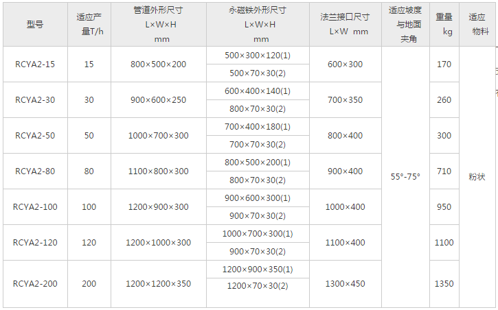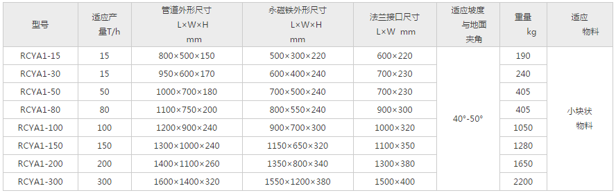 RCYA型傾斜管道式永磁除鐵器分為RCYAl、RCYA2兩種,包括無(wú)磁管道和永磁鐵兩部分,專用于封閉管道內(nèi)非磁性物料的除鐵,永磁除鐵器內(nèi)部采用高性能稀土強(qiáng)磁材料組成復(fù)合磁系。具有體積小、磁力大、重量輕、除鐵干凈、方便、無(wú)能耗、使用壽命長(zhǎng)等特點(diǎn)。