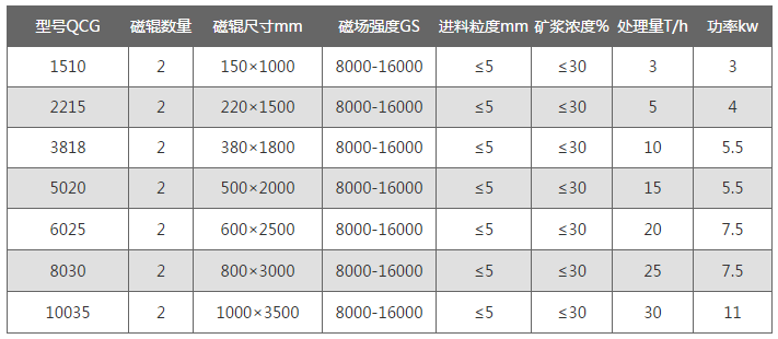 QCG輥式磁選機(jī)的作業(yè)原理為物料經(jīng)料倉通過導(dǎo)料盤進(jìn)入磁場區(qū),磁性礦物被吸附在磁輥表面旋轉(zhuǎn)到達(dá)精礦區(qū),毛刷將吸附在磁輥表面上的磁性礦刷脫,在高壓水的噴射下落到精礦斗里,部分未被吸附的磁性礦粒、非磁性礦粒和磁性較弱的礦粒進(jìn)入到下一級再選,最多個實現(xiàn)10輥組合,可對物料進(jìn)行多達(dá)10次的分選,特別是對強(qiáng)磁性、中磁性、弱磁性共存礦物有顯著的分選效果。